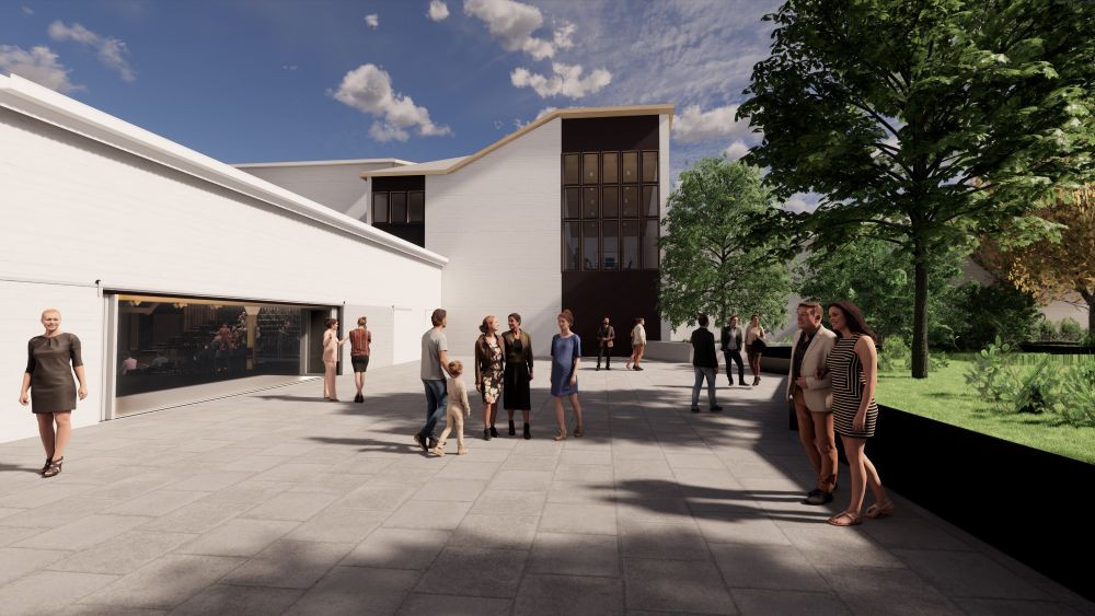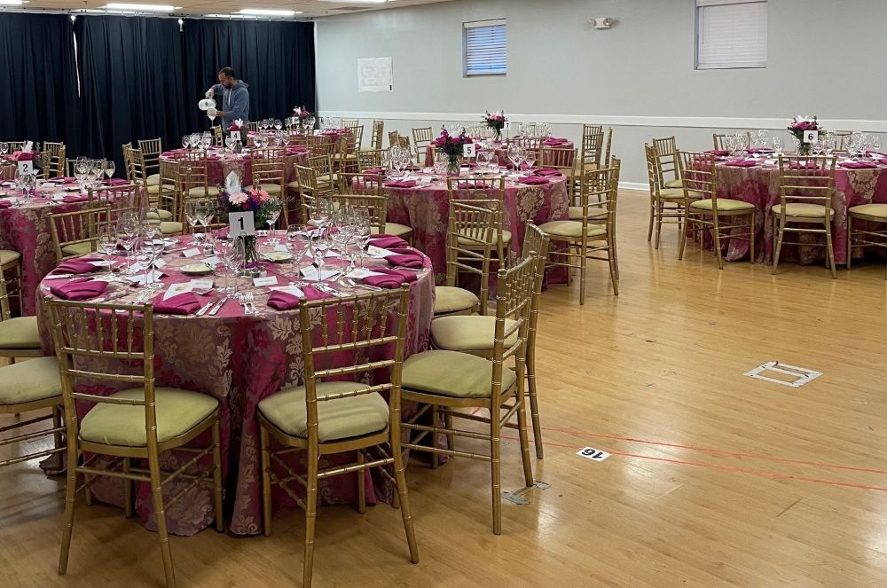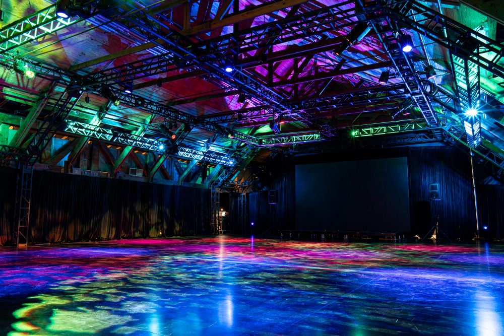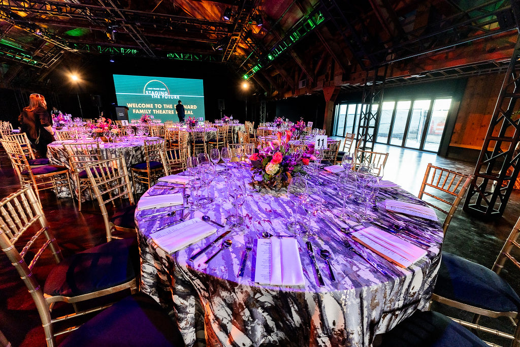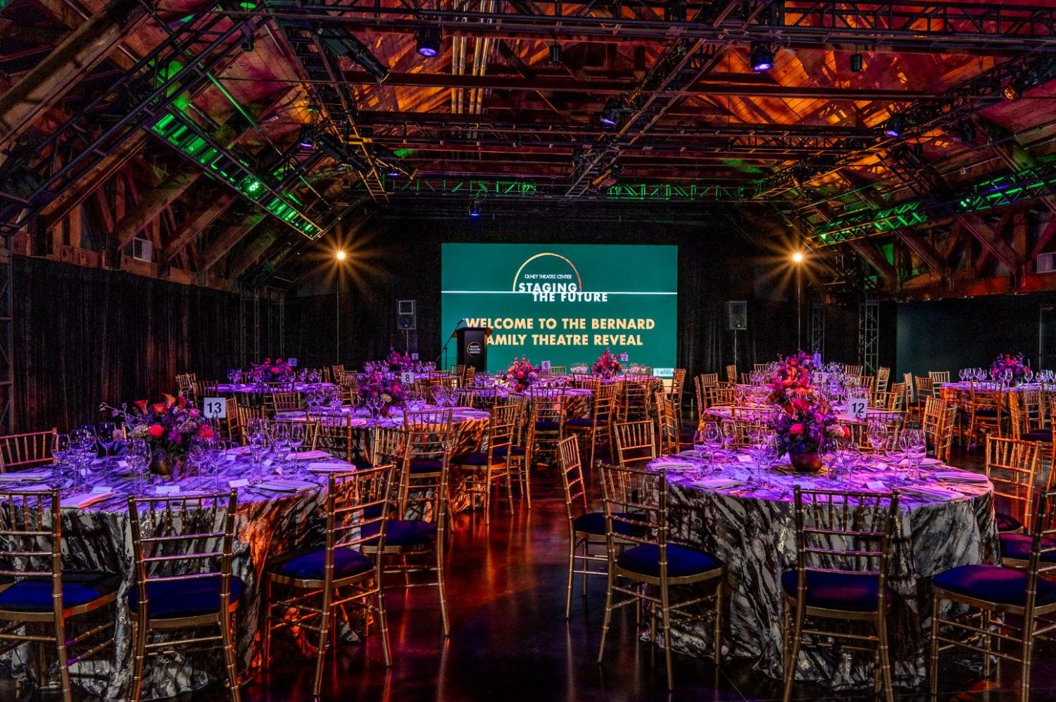 Built in 1938 and newly renovated in 2025 from the original Olney Theatre auditorium, this beautiful, versatile, fully flexible performance and event space is the gem of our campus. A unique location for weddings, Bar/Bat Mitzvahs, special events, seated dinners, and community gatherings, the Bernard Theatre is centrally located to complement most other spaces on our campus. Conceived as an adaptable production warehouse infused with memory and character, the space retains its 1930s wood trusses and connection to the outdoors while incorporating a freestanding, woven technical infrastructure. The Bernard Family Theatre can be transformed to fit your event needs and fits more than 600 people standing (no tables) or 280 with round tables. The Bernard Family Theatre includes a catering kitchen and easy access to the Cafritz Lobby and the Bernard Family Courtyard, which may be rented independently or alongside the Bernard Theatre.